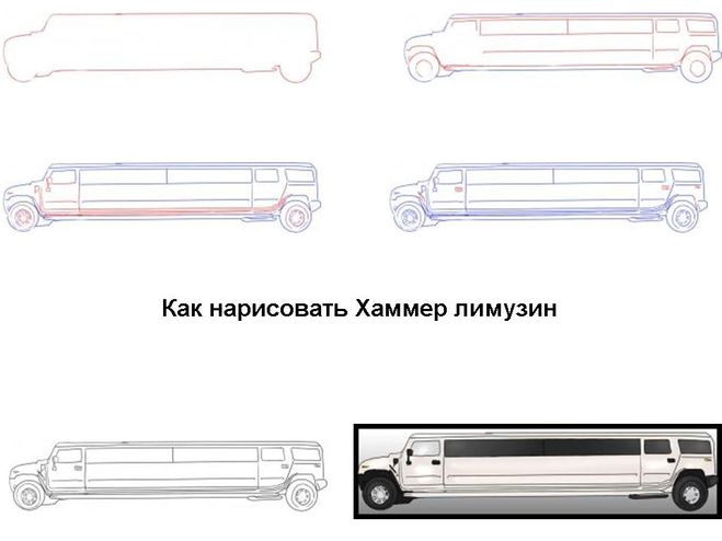 Далее - ещё одна одна схема, на этот раз рисуем внедорожник. Схема такая же, рисунок начинаем с прямоугольника, затем и неотъемлемую часть любого автомобиля - колёса. И потом так, как показано по этапам, просто повторяем все действия. Удачи в рисовании!