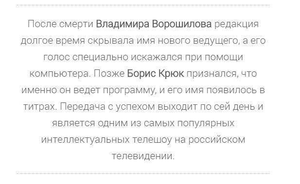 Нотки тембра беспристрастного, лаконичного и справедливого "голоса стен", программы "Что? Где? Когда?" принадлежавшего Владимиру Ворошилову - Ведущему этой легендарной программы (и только так - с большой буквы!) многие из игроков, и конечно же телезрители, пытаются сегодня угадать в голосе нового ведущего - Бориса Крюка... Не знаю кому как а мне эти голоса кажутся похожими, хотя новый ведущий кровно не связан со своим предшественником. Борис Крюк - новый ведущий программы "Что? Где? Когда?" приемный сын Владимира Ворошилова.
