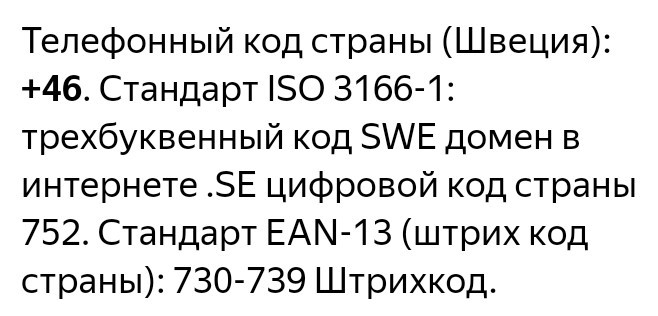 Я, ещё как только появились штрихкоды, начал их запоминать. Например 30- Франция, 40- Германия, 50- Великобритания. Бывает интересно только по одному штрихкоду узнать из какой страны тот или иной продукт или товар. И, разумеется, про код 46 я просто не мог не знать, это код России. А именно телефонный код 46 принадлежит Королевству Швеция. Телефонные коды меня интересуют гораздо меньше, чем штрих-коды на товарах. Получается, что мы со шведами по кодам как бы "братья".