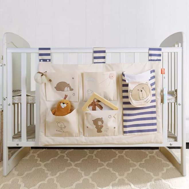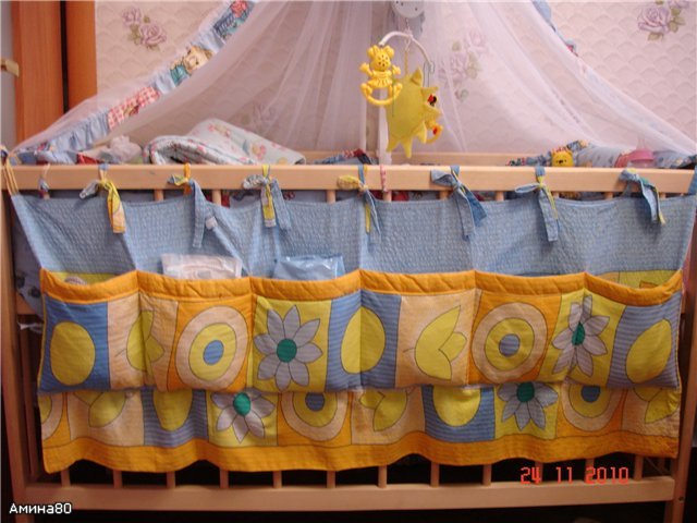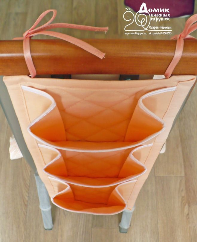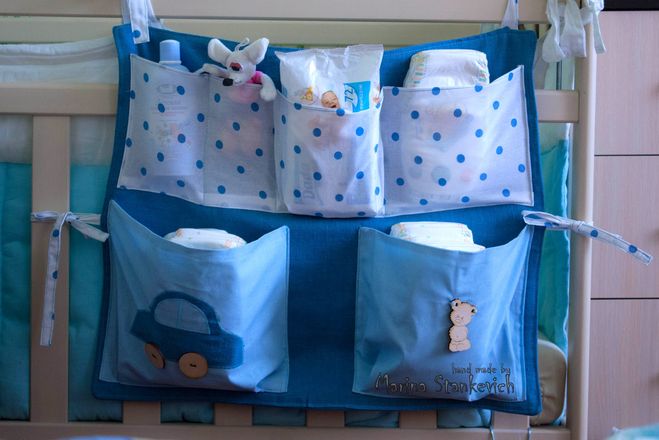 Всю ценность такого вроде простого элемента детской кроватки понимают лишь став родителями. Хочется чтоб все было под рукой и при этом нигде не валялось на полу, кроватке или тумбочке. Для таких целей удобно приобрести органайзер, который можно закреплять на кроватке. Ну а если хотите, то можно пошить и самим, ничего сложного здесь нет.