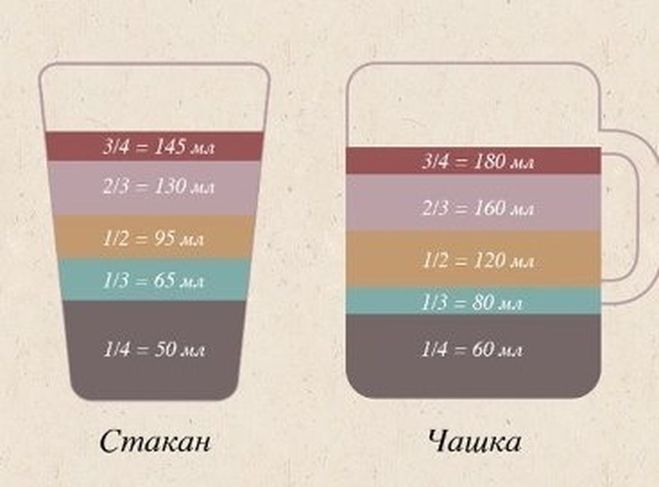 Далеко не все стаканы являются измерительными (мерными, мерочными). Не на всех стаканах есть шкала с указанными миллилитрами. Несмотря на это, самые обыкновенные классические стаканы, которые вмещают в себя 250 мл (чайный стакан) и 200 мл (гранёный стакан), помогут измерить количество воды, если мы рассчитаем, сколько жидкости в трети, в двух третях, в четверти и в трёх четвертях каждого из таких стаканов.
