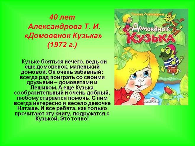 Сказка Александровой "Домовенок Кузька" очень интересная, а рассказывается в ней о лохматом домовенке, в жизни которого было много интересных поворотов. А начинается история с того, что в новой квартире девочка Наташа случайно находит маленькое существо в красной рубашке. Они познакомились и вскоре девочка узнала, что незнакомца зовут Кузькой и он живет целых семь веков.
