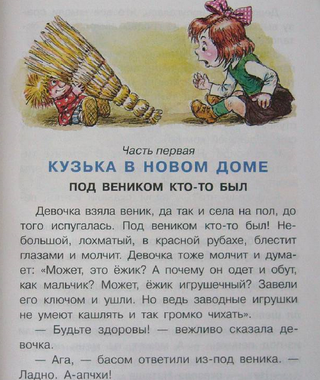 Услыхав, как кто-то громко чихает, Наташа отодвинула веник и вдруг увидела крошечное существо. Это был маленький домовенок, звали его Кузька.