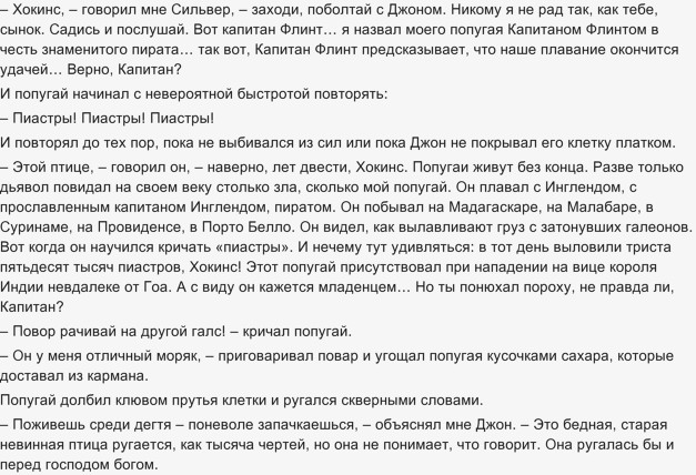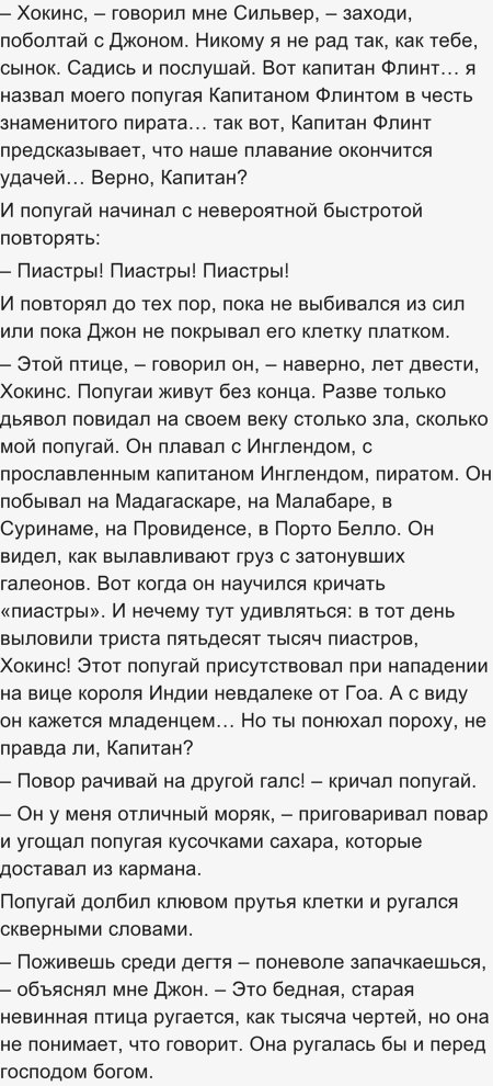 И у него был попугай, который любил слово Пиастры, он мог часами выкрикивать данное слово.