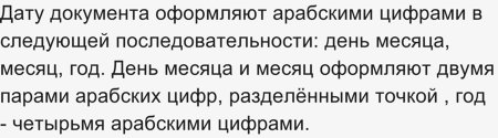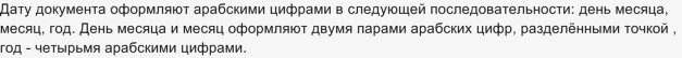 Дату записывают арабскими цифрами. Она состоит из дня, месяца и года. На указание дня и месяца отводится по две цифры, на указание года - четыре цифры. При этом используется между ними разделительный знак в виде точки. В конце точка не ставится.
