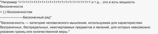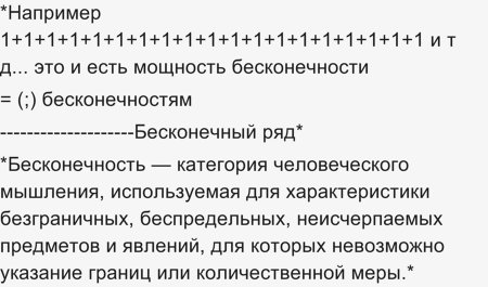 И существует истинная бесконечность (потенциальная бесконечность), когда есть возможность выполнять действия, например перечислять числа, искать их последовательность: 1, 2, 3, 4, 5... и т.д.