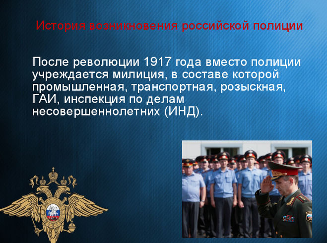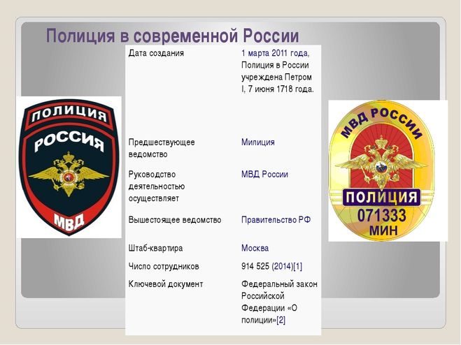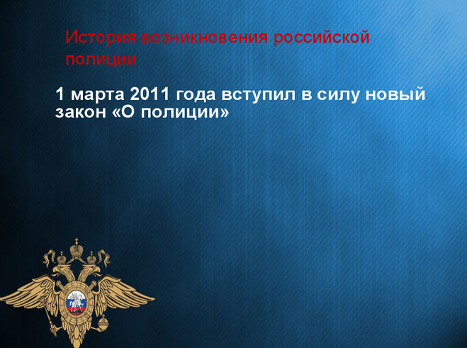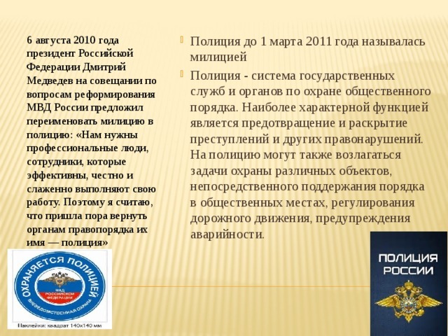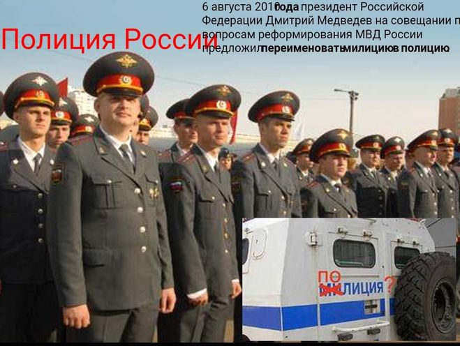 Далее надо обязательно сказать, когда именно милиция переименована в полицию (1 марта 2011). Дополнить историю.