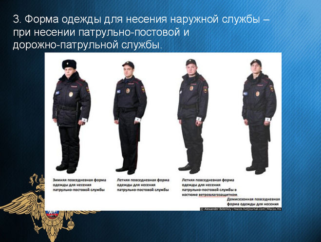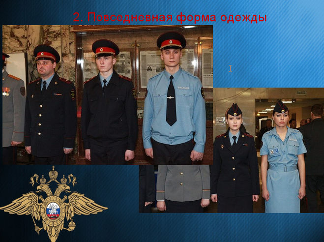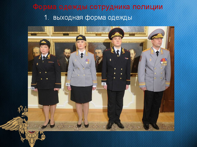 Можно показать на отдельном слайде фотографии с полицейской формой, стоит учесть, что в полиции работают и мужчины, и женщины.