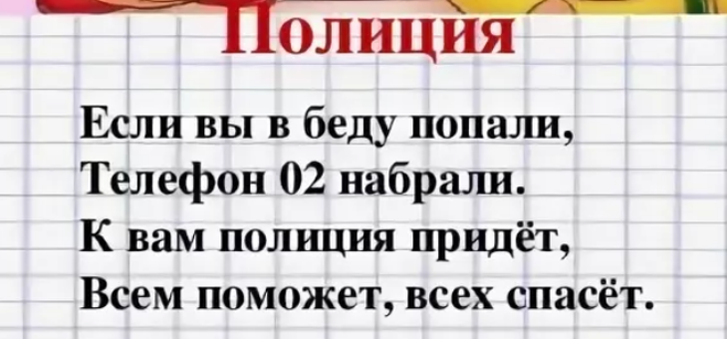 Можно также сделать слайд со стихотворением, из которого будут понятны простые истины: попал в беду - звони в полицию, набирай заветный номер - 02: