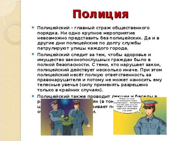 Далее желательно дать пояснение о том, что такое полиция, чем занимаются люди, которые там работают, какие есть подразделения в полиции.