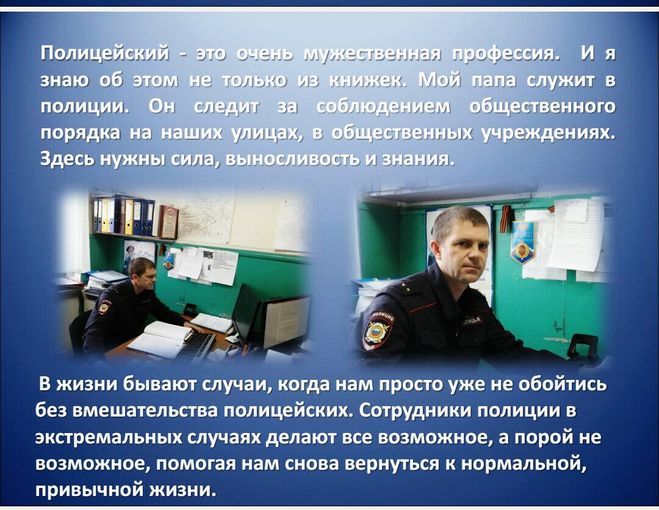 Далее вам нужно будет сделать фотоотчёт и постараться взять интервью у полицейского, если это возможно. В начале проекта приведите стихи о работе полиции, а закончить проект нужно вашим выводом, что вы узнали о работе полицейского.