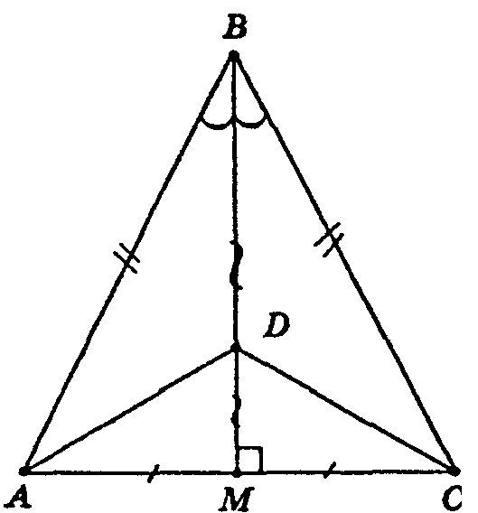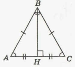Кроме того, высота равнобедренного треугольника, проведенная к основанию, является медианой (то есть делит основание на 2 равные части) и биссектрисой (делит угол, противолежащий основанию на 2 равные части).