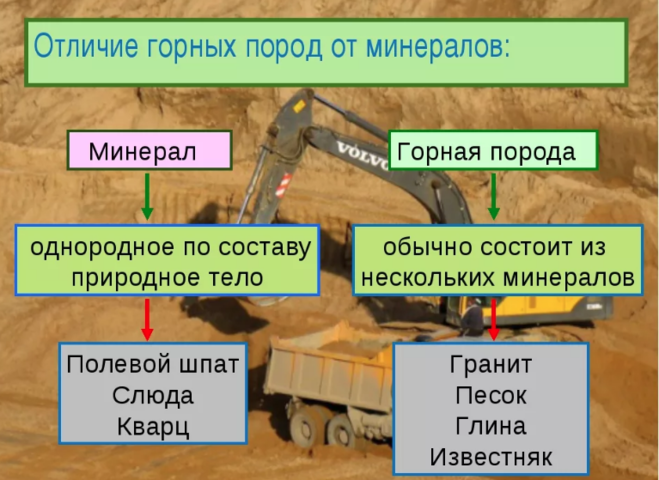 Горные породы образуются из двух или более минералов. Те, которые содержат полезные минералы, называются «рудными». Руда используется для производства товаров, которые мы используем каждый день, таких как дома, кастрюли и сковородки из нержавеющей стали, электроника, аккумуляторы, автомобили и удобрения. К драгоценным минералам относятся цветные металлы (например, железо, медь и никель), промышленные минералы (не содержащие металлов) и драгоценные (высокоценные) металлы, такие как золото, железо и платина. Горные породы могут быть магматическими, осадочными или метаморфическими.