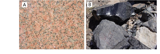 Магматические породы (от латинского « ignis », что означает «огонь») образуются в результате охлаждения и затвердевания магмы или лавы (подобно вулканической). Магматические породы могут образовываться под землей или на поверхности. Те, которые образуются под землей , называются интрузивными магматическими породами. Этот тип породы медленно остывает и содержит крупные кристаллы различных минералов, видимые невооруженным глазом. Гранит является хорошим примером [A] . Магматические породы, образующиеся на поверхности, называются экструзивными магматическими породами. Этот тип породы быстро остывает и содержит мелкие кристаллы. Обсидиан, камень, похожий на стекло, относится к этой категории [B] .