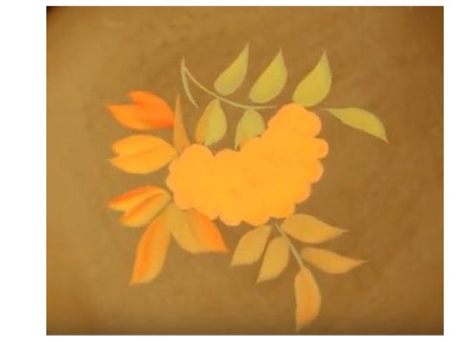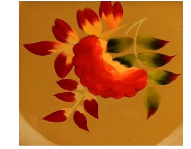 Данный промысел славиться очень эффектной росписью подносов. Для росписи в основном использовались растительные и цветочные мотивы, иногда это пейзажи. Мы рассмотрим как нарисовать цветочный поднос поэтапно. Сначала на листе бумаги мы рисуем сам поднос, форма может быть круглая, овальная или квадратная. Далее намечаем один центровой цветок, можно сделать три цветка, они будут у вас основой. Затем к ним подрисовываем лепесточки и бутончики, так же можно сделать для украшения вензеля или завитки. Цвет фона в основном рисуют чёрным, ну а цветы на ваше усмотрение. Можно их раскрасить разными цветами, а можно сделать к примеру в одной гамме. Образец и мастер-класс смотрите ниже.