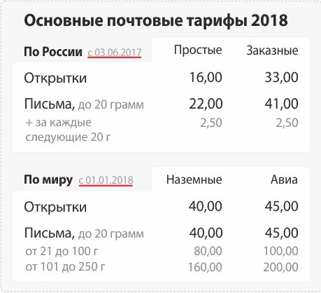 Сегодня последние числа декабря 2017, но некоторые тарифы Почты России изменены уже с середины декабря. Это относится к международной корреспонденции. Действовать они начнут уже с 1 января. Письма и открытки по цене были приравнены и раньше, поэтому ничего нового в этом плане не добавится. Письмо до 20 гр, как и обычная открытка будут доставлены наземным транспортом за 40 рублей, а комбинированным или авиа - за 45 рублей. Письма свыше 20 грамм оплачиваются дополнительно марками. Для этого не нужно обращаться к работникам почты, просто наклеить дополнительные марки и бросить в почтовый ящик.