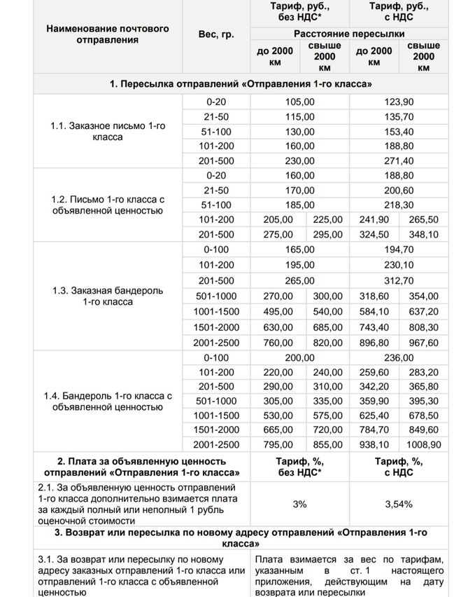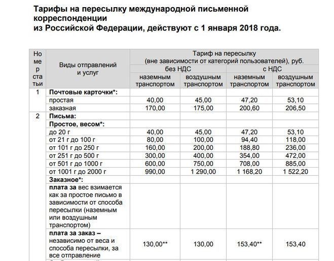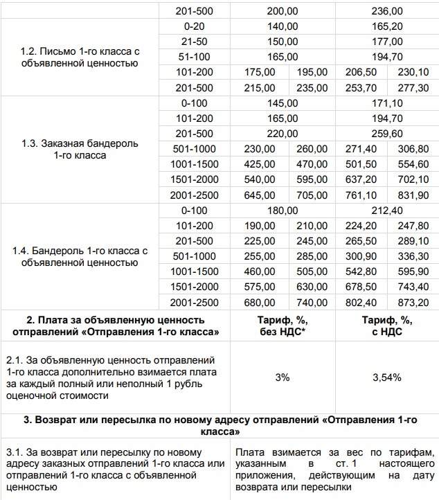 С начала 2018 года почта России подняла тарифы на отправления 1 класса. Цены в тарифах указываются как с НДС, так и без НДС, с НДС цены следующие: