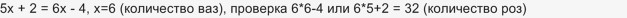и так пока не доходом до цифры 6, определяя методичным подбором и количество ваз и количество роз, 5*6+2=6*6-4 (32=32)