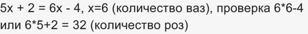 решив уравнение получаем 6 ваз и 32 розы, что соответствует поставленному условию: размещая в 6 вазах по 5 роз 2 остаются, ставя по 6 цветов 4х роз не хватает.
