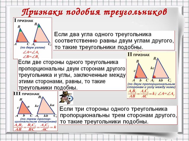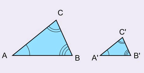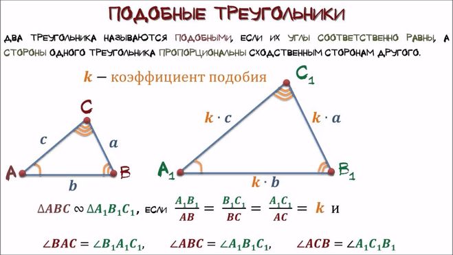 Подобными называются фигуры, одинаковые по форме, но разные по размеру. Треугольники считаются подобными, если у них углы равны, а их соответственные стороны пропорциональны друг другу.