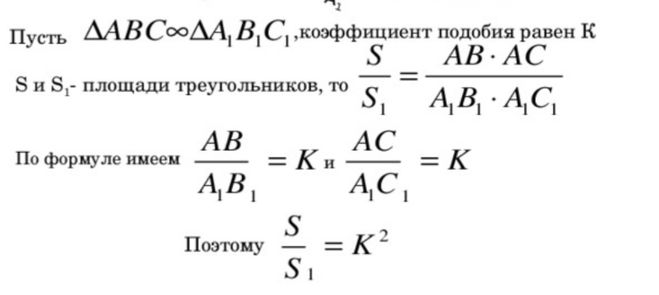 Также существует коэффициент подобия площадей подобных треугольников, равный квадрату коэффициента подобия треугольника.
