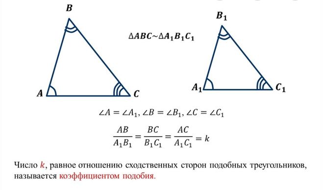 Треугольники называются подобными, если они имеют равные углы и соответствующие стороны пропорциональны. Число k, равное отношению соответствующих сторон треугольников, называется коэффициентом подобия.