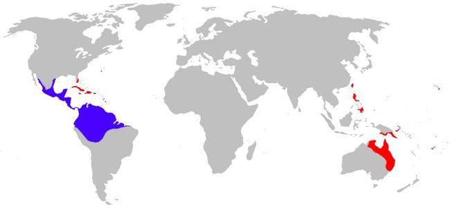 Ареал обитания жабы-ага на карте, красным цветом отмечены регионы, куда жабу-агу завезли искусственно: