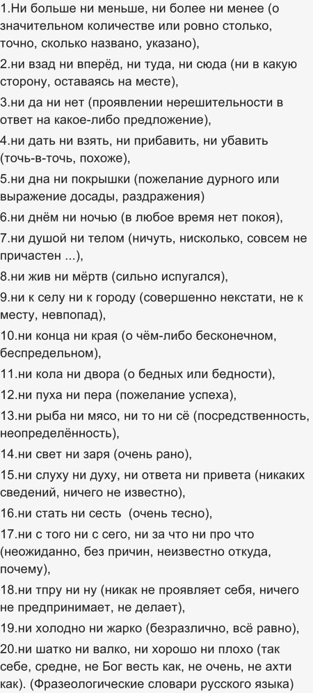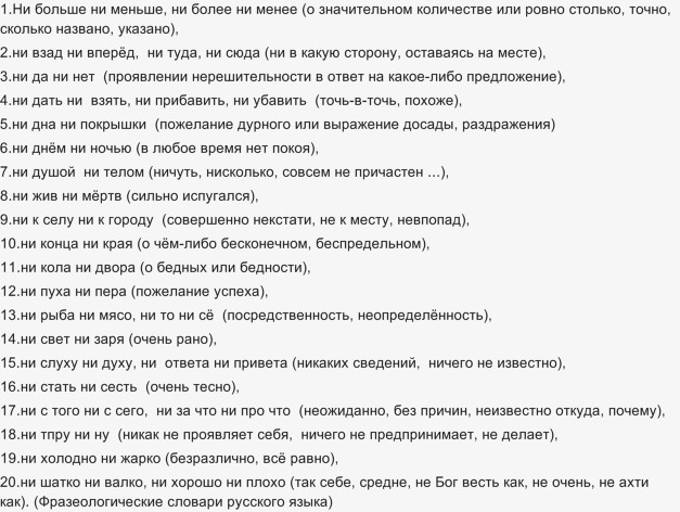 Как привести примеры фразеологизмов с союзом ни ни?