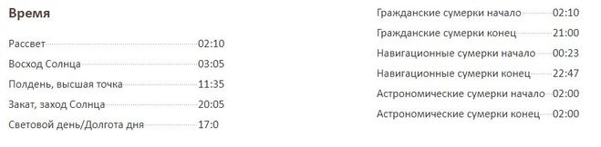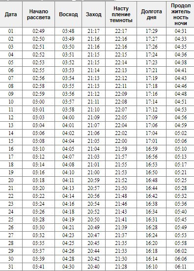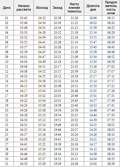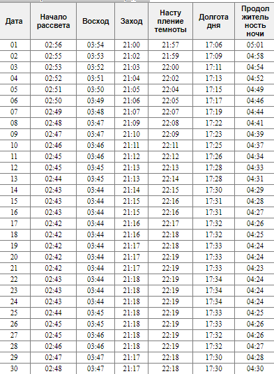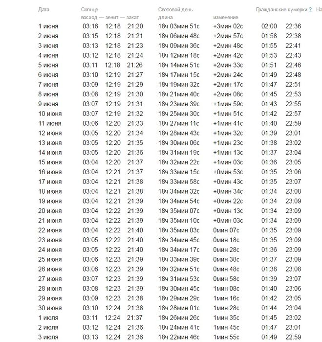 Как видим, в июне светает в 3 утра, в июле с 3 до 4 утра, а в августе начинает светать в 5 утра.