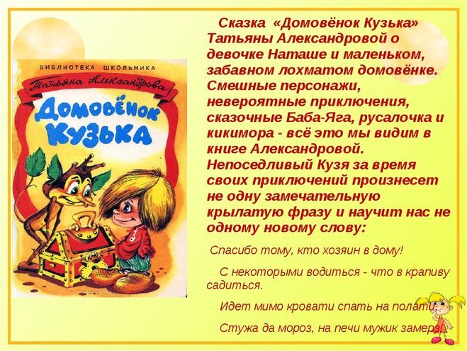 В ней рассказана интересная история о взаимоотношениях девочки Наташи и домовенка по имени Кузька.
