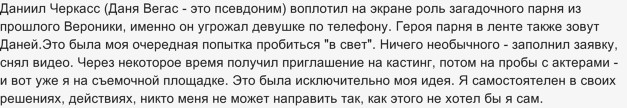 Он имеет некоторую известность и популярность как блоггер по имени Даня Черкас, и как Даня Вегас, а также за роль к кино "Школа", тоже парнишку там звали Даня, не надо было привыкать к образу...