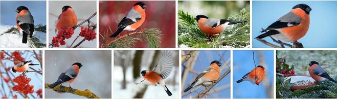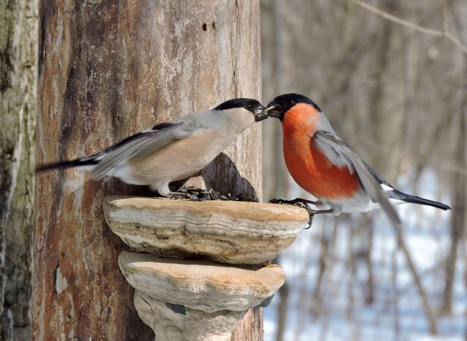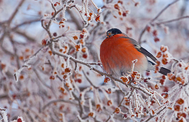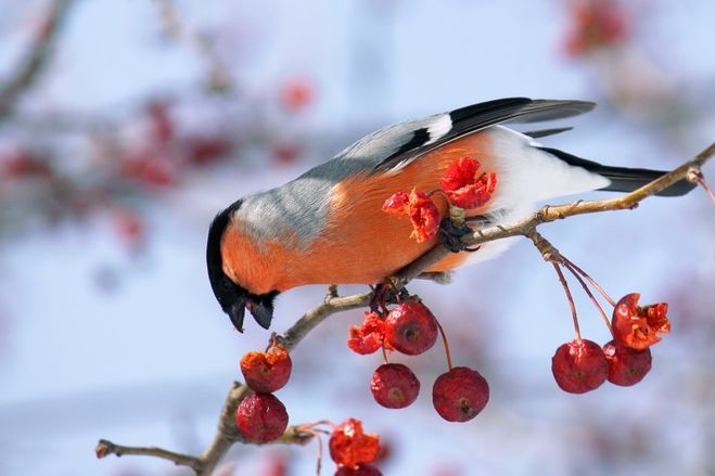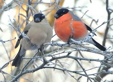 В зимний же период они любят кочевать у жилья человека. Нередко снегирей можно встретить на ветках калины или рябины в саду, а также около птичьей кормушки.