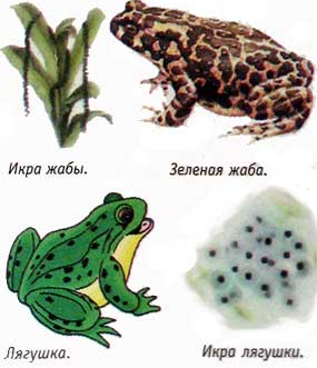 Та и другая принадлежат к амфибиям, перепутать их легко, очень схожи. У лягушки кожа ровная и длинные лапки, для прыжков эти удобства. У жабы наоборот лапки маленькие, кожа с пупырышками, тело недлинное и низкое. Основная их отличительная черта, у лягушки нет больших околоушных желез, у жаб они расположены в задней области головы и для жаб особенность наличия бородавок. Жаба кладет икру особой лентой, ее длина порой 10 м, присутствует от 1200....6800 яиц в 2...4 в ряд, такая лента запутана в водорослях или покоится на грунте водоема до появления головастиков.
