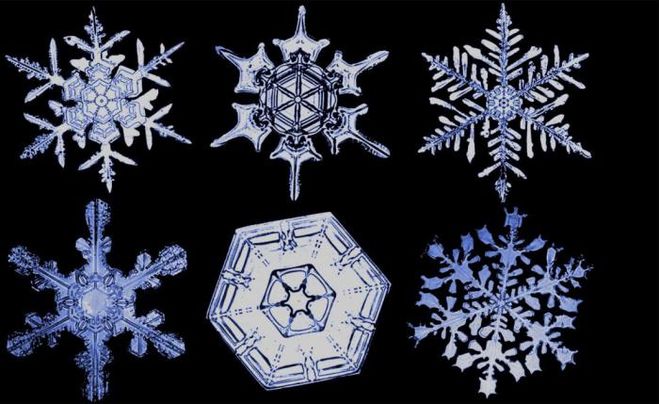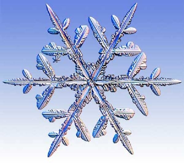 Все снежинки шестиконечные, при этом обладают разной формой. Это зависит от ряда факторов: температура, влажность. Причем, чем выше будет влажность, тем более сложный узор получится.