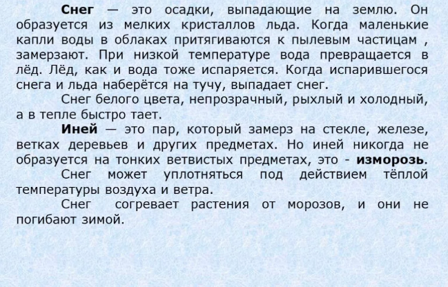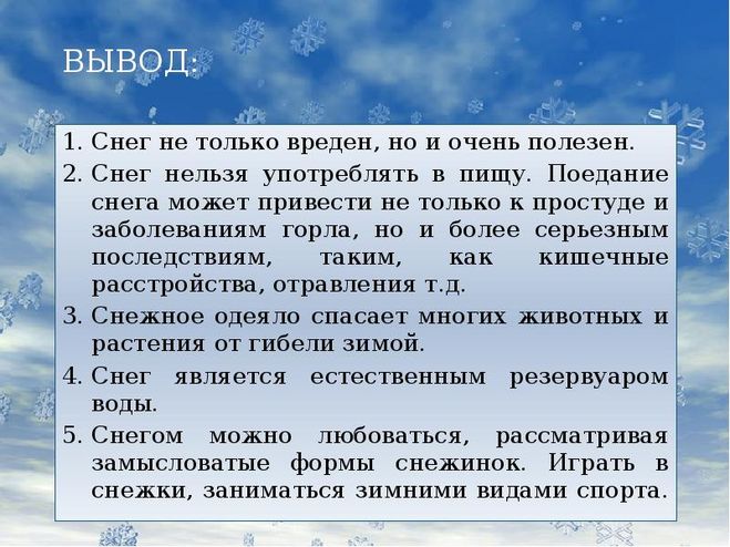 Снег имеет важное значение в природе: он спасает посевы и растения от вымерзания, помогает животным выжить зимой. Снег не имеет вкуса и запаха.