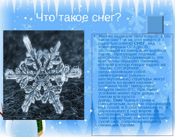 Предмет окружающий мир и сообщение о снеге по нему обычно ориентировано на младшую школу, поэтому слишком сложным его делать не нужно. Доклад о снеге может быть таким по содержанию.