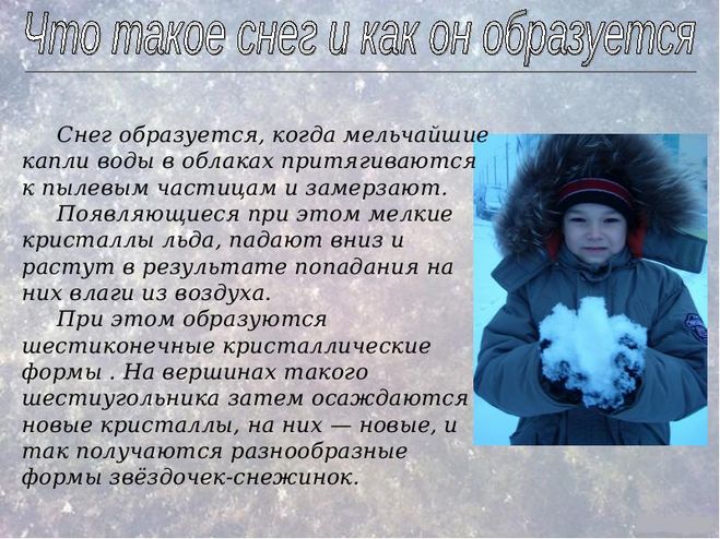 Прошла дождливая осень и пришла зима с морозами, вьюгой и снегом. Снег белым ковром покрыл поля и луга. Деревья и кустарники украсились снежными шапками. Снег искрится, переливаясь разноцветными огоньками. Но откуда он взялся?