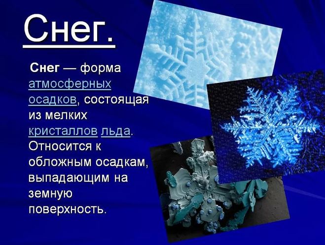Снег представляет собой твердые осадки, которые выпадают из облаков в виде снежинок.