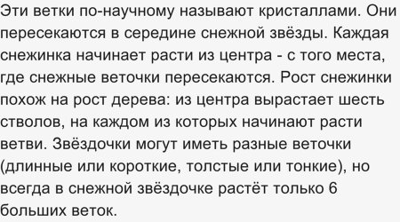 Каждая снежинка - это крохотный кристаллик, а если рассмотреть её под микроскопом, то можно обнаружить, что она напоминает шестиконечную звездочку. Причем на каждом конце звездочки имеется белая веточка, из которой образовались веточки поменьше.