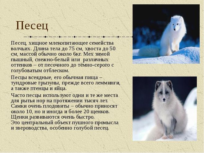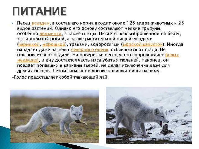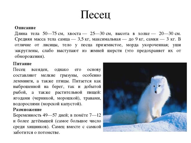 Окружающий мир 4 класс. Песец - типичный представитель животного мира тундры. Его еще называют полярной лисой. Животное характеризуется средними размерами, около 40 см высотой, весом до 10 килограммов, очень красивым пушистым мехом, пушистым хвостом. Песец дважды в год линяет: летом он серого цвета, зимой становится ослепительно белым, не заметным на снегу. Питается песец яйцами, ведь в тундре нет высоких деревьев, птицы вьют гнезда прямо на земле. Также песцы охотятся на взрослых особей птиц за грызунами, обитающими в тундре, чаще сего ему попадается лемминг. Ученые часто наблюдали песцов, доедающих добычу за белыми медведями.