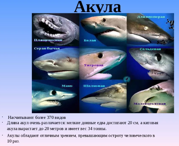 В природе водится более 500 видов акул. Это рыбы и водятся они в морях и океанах. В зависимости от вида, акулы предпочитают разную глубину и имеют разные размеры. Большиство акул являются хищниками.