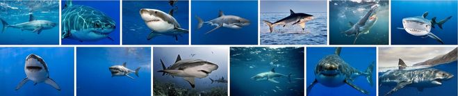 Насчитывается более 350 видов акул. Они существуют миллиарды лет, и у них есть великий предок. По оценкам, мегалодон находился на глубине от 16 до 20 метров при массе от 50 до 100 тонн (окаменелости очень неполны: зубы и элементы позвоночника). По сравнению с зубами большой белой акулы, зубы мегалодона по крайней мере в 4 или 5 раз больше зубов белой акулы. Глубоководные акулы (такие как синяя акула или синяя кожа) с гидродинамическим телом движутся за счет мощного хвостового плавника.