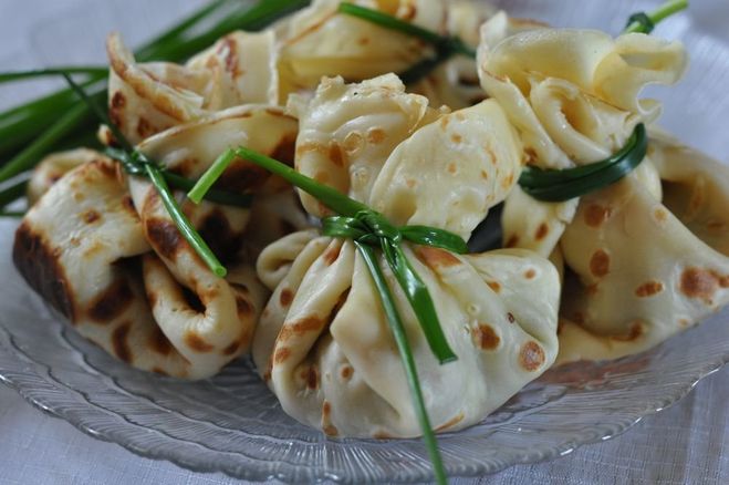 Начинка для таких блинов, и для блинов вообще, чтобы она не вытекала и не просачивалась наружу, должна быть достаточно плотной. Например, творог, ветчина с сыром... Можно связать блинный мешочек ниточкой, можно перышком зеленого лука, если начинка для блинов не сладкая.