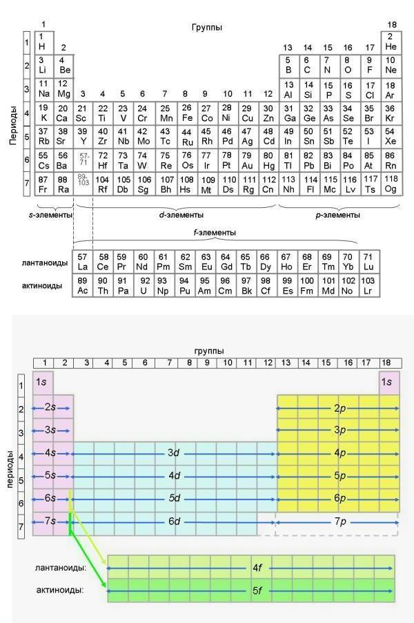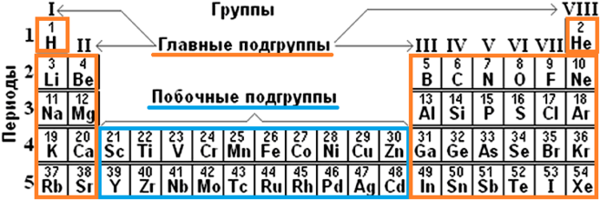 На таблице это легко разобрать, ведь элементы главных подгрупп сдвинуты влево, а элементы побочных подгрупп сдвинуты в право (и ячейки окрашены в голубые цвета).