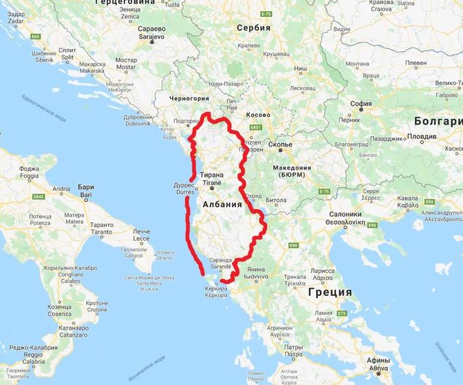 Албания окружена (граничит) с Черногорией и Сербией на севере, Македонией на востоке и Грецией на юге. Самая длинная граница страны - с Грецией, протяженностью 282 километра . Страна также расположен напротив юга Италии через Адриатическое море.