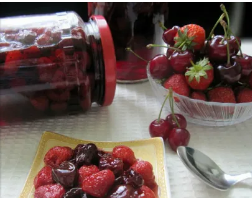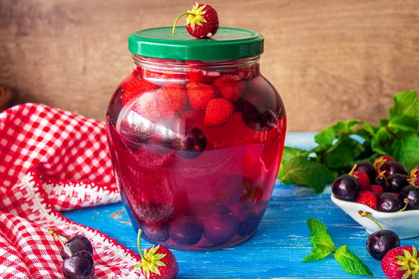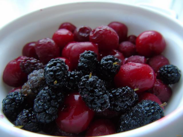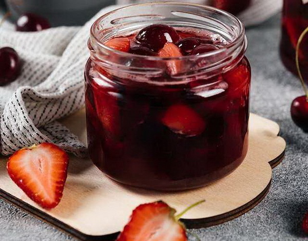 Например, хорошо сочетается черешня с клубникой. Рецепт такой: берем по 200 грамм клубники и черешни, 150 грамм сахара и 1,5 литра воды.