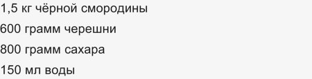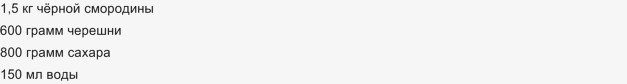 У нас частенько варили варенье из чёрной смородины с черешней - просто вкуснотища. Решила привести рецепт его, ведь в нём кислинка от смородины как бы прикрывается сочностью и сладостью черешни, а для его приготовления нам нужно: