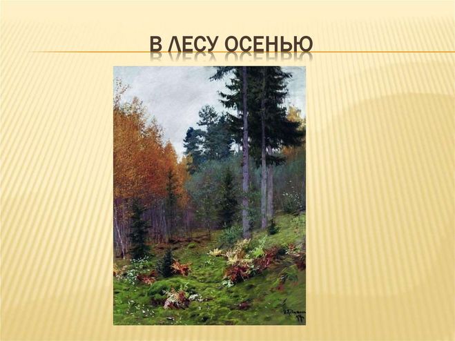 Свою картину под названием "В лесу осенью", Левитан написал в 1894 году. Это полотно у знаменитого художника является одним из самых знаменитых. Видно, что он мастер пейзажей со своим неповторимым стилем. Автор не просто изобразил природу, но и вложил в работу частичку своей души и большую любовь к родине. Глядя на это полотно, словно ощущаешь себя частью природы, и чувствуешь покой и умиротворение. На переднем плане видны зелёные мох и трава, но вот папоротник уже свою окраску изменил. На заднем плане, слово неприступной стеной, стоит хвойный лес во всем своём величии. Ещё около опушки видим молодые берёзки. Они уже сменили свои наряды на жёлтые и оранжевые. День стоит тихий. Скорее всего автор изобразил конец сентября т.к много зелёного ещё на картине. Небо затянуто тучами, воздух прозрачный, природа готовится к зиме. Мне понравилась эта картина, ведь смотря на неё хочется природу беречь, любить и понимать.