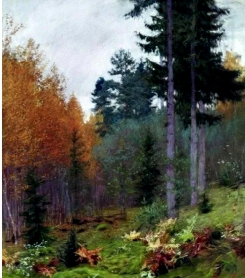 В лесу царит тишина и покой, несмотря на то, что что небо затянуто тучами. Такой прозрачный воздух, наполненный запахом хвои, грибов и последних лесных цветов, бывает только осенью. Создаётся праздничное ощущение радости, счастья и вечного мира.