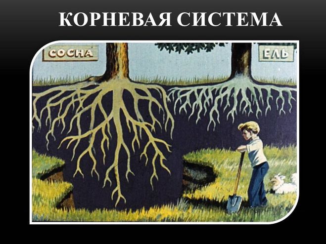 На приведенном ниже рисунке видно, что корни ели располагаются возле поверхности, в отличие от более устойчивой сосны.